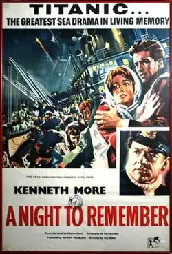A Night to Remember is a 1958 British historical disaster film, directed by Roy Ward Baker. Its screenplay by Eric Ambler was based on the 1955 book by Walter Lord, depicting the sinking of the RMS Titanic on 15 April 1912, after it struck an iceberg. The film recounts the events of that night in a documentary-style fashion in considerable detail.[5] It stars Kenneth More as the ship's Second Officer Charles Lightoller and features Michael Goodliffe, Laurence Naismith, Kenneth Griffith, David McCallum and Tucker McGuire.