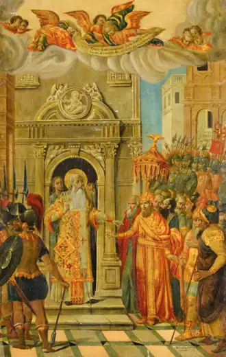 He was one of the founders of the early Christian Church and one of the most important authors. He wrote over 700 sermons, biblical commentaries, moral discourses, and theological treatises. Numerous artists have depicted his feud with Aelia Eudoxia. Painters from the island of Lefkada adopted the theme. Three Greek painters created similar works. Makarios Lefkas, Spyridon Venturas, and Stylianos Devaris. The actual event is John Criticizing Empress Eudoxia. In this version, the empress is not present but a messenger communicates with John. The same messenger holding an umbrella was behind her in earlier versions of the painting from which she appears. The work was sold by Sotheby's in London on November 11, 2008, to a private collector.[3][4]