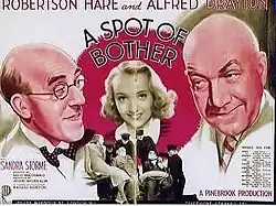A Spot of Bother is a 1938 British comedy film directed by David MacDonald and starring Robertson Hare, Alfred Drayton, Sandra Storme and Kathleen Joyce.[2] The film is a farce in which a bishop unwisely decides to loan the cathedral funds to a dubious businessman. Meanwhile, his secretary is involved with smuggled goods.[3] It was shot at Pinewood Studios and adapted from a play by Vernon Sylvaine. The film's sets were designed by Wilfred Arnold.
