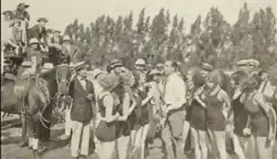 Another scene that captured the attention of critics was a polo match, organized by the hosts of a garden party, that featured a team of barefoot blondes wearing one piece bathing suits playing a team of brunettes attired in the same manner.[5]