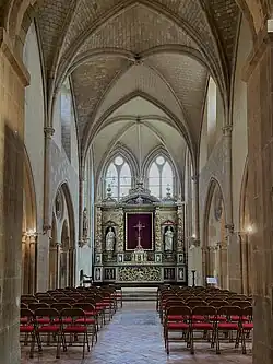 Inside the church, the retablo was reworked in Baroque style during the Genovese intervention in the 1640s. At the same time, the church was divided into two parts, one dedicated to the canons and the other to the parishioners.[8] The retablo includes columns decorated with grape vines and birds, which symbolize the Eucharist and life. The two statues depict Saint Honorine (who can be recognized by a horn with flowers) and Saint Barbara (with a tower as her symbol).