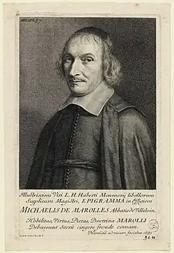 Abbé Michel de Marolles (born in Genillé (Indre-et-Loire) on July 22, 1600; died in Paris on March 6, 1681) was a French translator and historian, renowned for his collection of prints. Tonsured in 1610, he was abbot of Villeloin from 1626 to 1674. Author of numerous verse translations of Latin authors, he was a frequent visitor to salons, notably that of Madeleine de Scudéry. He is best remembered for the collection of prints he amassed: over 120,000 engravings (including more than 200 by Rembrandt), which Colbert bought for King Louis XIV.