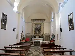 The interior has a central nave and two aisles in the Romanesque style, with Gothic influences.[3] The aisles contain 14th-century tombs and frescoes.[1] The interior was restored in 1954.