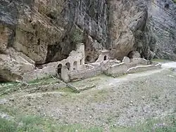 The remains of the abbey show a gate leading to an inner courtyard bordered by a portico with three arches, on the north side of which is a bell tower with an open arch. The interior of the church must have had three naves with a stone slab floor.