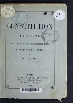 - On the Ottoman Constitution: (1877). La constitution ottomane du 7 zilhidjé 1293 (23 décembre 1876) Expliquée et Annotée par A. Ubicini. Paris: A. Cotillon et Co.. - PDF file
