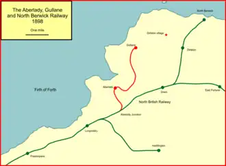 Settlements to the west relied on road connection to the main line for travel to Edinburgh for many years, but in 1892 a scheme was promoted for a new railway branch from Longniddry, on the main line railway, to North Berwick, running through Aberlady, Luffness and Gullane. The proposed line was independently supported, although the North British Railway were favourably disposed in the background.[1] However, when the bill for the Aberlady, Gullane and North Berwick Railway was presented, the North British Railway objected, as did a local landowner, Walter Hope, who saw that his farm and house would be prejudicially affected by the proximity of the course of the line. The NBR now saw that the line running through to North Berwick would abstract business from their own line.