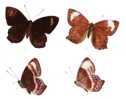 Abisara kausambi, the straight plum Judy, is a small but striking butterfly found in the Indomalayan realm that belongs to the Punches and Judies, that is, the family Riodinidae.