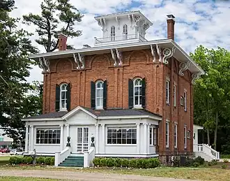 The Abram C. Fisk House is a two-story red brick Italianate structure with a hip roof crowned with a cupola. The house measures 40 feet by 40 feet and stands on an ashlar stone foundation. The facade is symmetrical, and is decorated with raised brick pilasters and arched head windows. The eaves are supported with oversized paired brackets, shaped in a wheel-with-daisy pattern.[2]