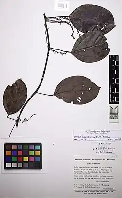 Abuta colombiana is a species of flowering plant in the Menispermaceae family. It is part of the genus Abuta, which consists of about 32 species native to tropical Central and South America.[2][1] Abuta colombiana is native to Colombia and northern Brazil,[2] and has been observed in Ecuador and Panama.[1] It was first published in Brittonia in 1938, described from two specimens collected from the Chocó Department in north Colombia.[3] It is closely related to Abuta imene but can be distinguished by the flower stamens.[3]