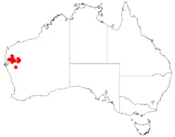 This species of Acacia grows in clay or clay loam, sometimes in rocky situations, in a small area near Gascoyne Junction in the west of Western Australia.[2]