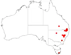 Red-tip wattle is found along the tablelands of the Great Dividing Range from Dalveen in south-eastern Queensland to Torrington in north-eastern New South Wales. It is found in sandy granite based soils as a part of forest communities.[2]