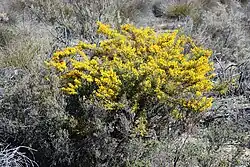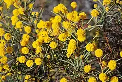 Acacia chapmanii is a dense, intricately-branched shrub that typically grows to a height of 0.5–2 m (1 ft 8 in – 6 ft 7 in) and has glabrous branchlets. Its phyllodes are sessile, usually continuous with the branchlets, needle-shaped, 20–30 mm (0.79–1.18 in) long, 0.7–1 mm (0.028–0.039 in) wide, rigid and green to more or less glaucous with a sharp point on the tip. There are stipules 1–3 mm (0.039–0.118 in) long at the base of the phyllodes. The flowers are borne in a spherical head in axils on a peduncle 10–15 mm (0.39–0.59 in) long, each head 4–5 mm (0.16–0.20 in) in diameter with 14 to 27 golden yellow flowers. Flowering time depends on subspecies, and the pods are glabrous, strongly curved to coiled, up to 40 mm (1.6 in) long and 2.5–3.0 mm (0.098–0.118 in) wide with broadly elliptic seeds 2.5–3.0 mm (0.098–0.118 in) long, with a more or less club-shaped aril.[2][3][4][5]