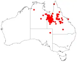 Turpentine bush occurs in western parts of Queensland and westwards to the Mount IsaCloncurry area where it on stony often lateritic plains with shallow, sandy soils or in undulating country and on escarpments in grassland or Eucalypt woodland and spinifex communities. A single collection has been made near Lake Nash in the Northern Territory.[3]