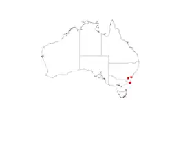 Narrabarba wattle has a limited distribution about 20 km (12 mi) south of Eden in south western New South Wales with the bulk of the population confined to the Nadgee State Forest and within the boundaries of the proposed Narrabarba Hill Flora Reserve over a range of about 3 km (1.9 mi). Another smaller population in situated in Beowa National Park. The species is found on rocky rhyolite and apatite ridge-tops with nutrient poor skeletal sandy soils but sometimes in brown to black loamy soils. The estimated population is about 6,000 individuals in an area of around 4 ha (9.9 acres).[1][7][8]