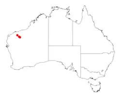 The species has a spreading habit with a height of 0.3 to 2 m (1 ft 0 in to 6 ft 7 in) and produces yellow flowers between July and September. It has a scattered and limited distribution around and in Karijini National Park.[2]