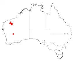 It is native to an area in the Pilbara region of Western Australia where it is often situated on scree slopes of low ranges growing in stony red loamy soils.[1] It has a limited range mostly within the Hamersley Range National Park where it is considered to be abundant on the lower slopes where the watercourses exit the range.[2]