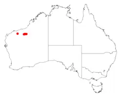 It is native to an area in the Pilbara region of Western Australia.[2] It has only a few disjunct populations that are situated near where the Oakover River and Davis River meet to the east of Nullagine in rocky areas composed of Mosquito Creek sedimentary rocks.[1]