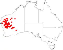 In Western Australia it is found scattered across a large area in the Wheatbelt, Mid West and Goldfields regions of Western Australia.[4] It is also found through interior areas of South Australia.[1]