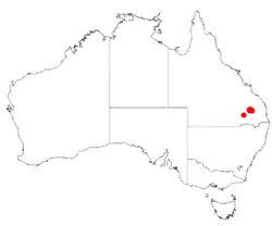 The shrub has a limited distribution in south eastern Queensland to the north of Chinchilla in the Barakula area where it is found in undulating country usually stony ridges where it grows in sandy or clay lateritic soils sometimes with ironstone gravel as a part of open Eucalyptus woodland communities.[2] It is found in only one population in the Barakula State Forest within the catchment area of the Condamine River in an area of around 28 ha (69 acres). In 1994 the total population was estimated to be 10,080 individual plants where 4,200 are mature and the remainder are juveniles. They were distributed over three separate stands with a large variation in the density of plants. None of the plants are found in conservation areas.[1]