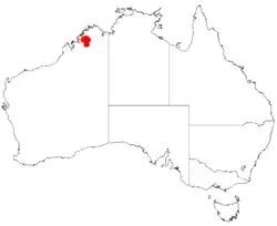 It is native to a small area in the Kimberley region of Western Australia.[1] It has a disjunct distribution between two localities, in the Packhorse Range and around Mount Agnes which is found around 80 km (50 mi) north from the Packhorse range, in the western part of the Kimberley. It is found among rocky outcrops and on plains growing in the sandstone rocks that are veined with quartzite as a part of Eucalyptus miniata woodland over spinifex communities.[2]