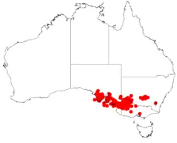 The bulk of the population of the shrub is found throughout south eastern Australia from the Eyre Peninsula near Widunna in the west through to Mallee Cliffs National Park in New South Wales to the north east and Gunbower in Victoria in the south east where it grows in a variety of soil types and vegetation communities.[1] It is often found in sandy to loamy soils in mallee country.[2]