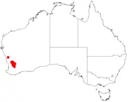 It is native to an area in the central Wheatbelt region of Western Australia where it is commonly situated on plains and hillsides growing in sandy soils usually over or around laterite.[1] The bulk of the population is found between Wongan Hills in the north west and Kellerberrin in the south east where it is usually a part of scrub and tall shrubland communities.[2]