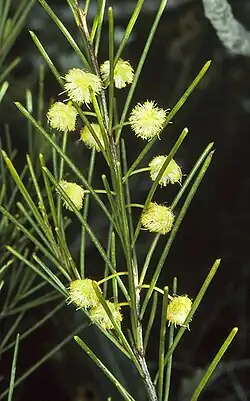 The shrub can grow to a height of up to 3 metres (9.8 ft) and has a spindly habit with slender lenticellular branchlets.[2] Like most species of Acacia it has phyllodes rather than true leaves. They are found on short stem-projections usually in groups of two or three in the nodes of mature branchlets with a rather crowded appearance. The slender, rigid, evergreen phyllodes are erect to inclined and more or less quadrangular in section. They are pungent and usually have a length of 2 to 6 cm (0.79 to 2.36 in) and a width of 0.5 to 1 mm (0.020 to 0.039 in) with four main nerves. The shrub bloom between July and September and[3] produces simple inflorescences that occur singly in the axils that have spherical flower-heads containing 12 to 30 cream to pale yellow coloured flowers. After flowering firmly chartaceous, dark brown seed pods that resemble a string of beads appear. The pods are up to 9 cm (3.5 in) in length and have a width of 3 to 4 mm (0.12 to 0.16 in) containing longitudinally arranged seeds. The dull black to dark mottled brown to yellow seeds have an oblong shape and a length of 4 to 6 mm (0.16 to 0.24 in).[4]
