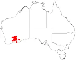 It is native to an area in the Wheatbelt and Goldfields-Esperance regions of Western Australia where it is commonly situated around salt lakes, on undulating plains and in low lying areas growing in gravelly sandy or loam or clay loam soils.[1] It has a scattered distribution from around Yellowdine and Coolgardie in the north down to around Boingaring Rocks in the south as a part of open scrubland or Eucalyptus woodland communities where it is often associated with Melaleuca uncinata.[2]