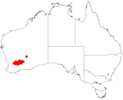 It is native to an area in the Wheatbelt and Goldfields-Esperance regions of Western Australia where it is commonly situated on sandplains growing in sandy lateritic soils.[2] The range of the shrub extends from around Kellerberrin in the west to around Hyden in the south and Yellowdine in the east and is commonly found in disturbed areas like road verges and will regenerate after bushfires, it is usually a part of tall shrubland communities.[3]
