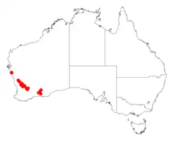 It is native to an area in the Wheatbelt and Mid West regions of Western Australia. where is found growing in clay, loam, sandy loam, and gravelly sandy clay soils.[1] It has a scattered distribution from around Kalbarri in the north west down to around Coorow in the south and Bruce Rock in the south east where it is usually a part of open Eucalyptus woodland communities.[2]