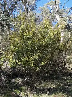 The glabrous shrub typically grows to a height of 2 to 3 metres (6.6 to 9.8 ft) and can sometimes have a procumbent habit.[1] It has smooth to tessellated grey coloured bark and glabrous, terete and resinous branchlets. The rigid, green phyllodes have a very narrowly elliptic to linear-lanceolate shape and are straight to slightly curved. The phyllodes are 1 to 3.5 cm (0.39 to 1.38 in) in length and have a width of 2 to 4 mm (0.079 to 0.157 in) with a prominent midvein and a pungent-pointed apex. The shrub blooms between August and November and produces simple inflorescences that occur singly or in pairs in the axils. The spherical flower-heads have a diameter of 4.5 to 7 mm (0.18 to 0.28 in) and contain 30 to 45 bright yellow or pale yellow to white coloured flowers. After flowering straight and flat, papery seed pods form that are 1.5 to 5 cm (0.59 to 1.97 in) in length and 4 to 7.5 mm (0.16 to 0.30 in). The smooth and glabrous pods have a few fine lateral veins near the margins.[2]