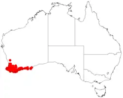 It is native to an area in the South West, Goldfields-Esperance and Great Southern regions of Western Australia where it is commonly situated on hills, rises and ridges growing in sandy, loamy or clay loam soils that can contain lateritic gravel.[1]