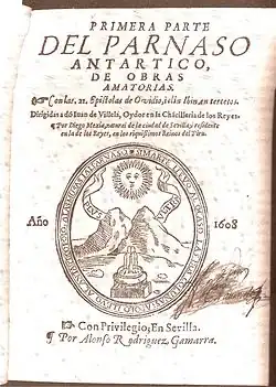 The most influential of the Academia Antártica's works, the Primer parte del Parnaso Antártico de obras amotorias (Antarctic Parnassus, Part One: Poems of Romance) was printed in Seville in 1603.[12] Its centerpiece is the new Spanish-language translation of Ovid's Heroides, penned by Diego Mexía de Fernangil, a Spaniard who traveled extensively in Mexico and Peru and was a fundamental member of the Academia.[13] The volume also contains Mexía's "El autor a sus amigos" ("From the Author to His Friends"), a narrative of his travels through the Spanish Empire.[13]