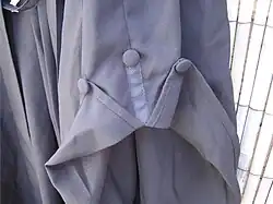 Bachelors, holders of advanced first degrees (such as the MChem, MMath, etc.) and holders of foundation degrees or undergraduate diplomas wear a black stuff or silk gown of the Oxford BA shape, but with the forearm seam divided for 4" and the two flaps turned back and held in place with two buttons; between the flaps is a short length of black ribbon, held by a third button. This is said to represent the Prince of Wales's feathers.