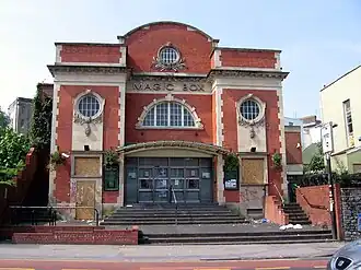 In 1955, it became a Christadelphian Hall or chapel.[4] The Wetherspoons pub chain purchased it in 1998 it was adapted for use as a bar under the name The Magic Box.[5] The name was chosen in honour of William Friese-Greene a Bristolian founder of cinematography.[2] The pub closed in 2006 and was refurbished as a new venue for Jesters Comedy Club, which opened in 2008 with the venue known as The Metropolis.[6][7] The Metropolis was used as a music venue hosting a variety of local and national bands.[8] Jesters moved to another venue in 2012 and the building was placed on the market for £350,000.[2][9]