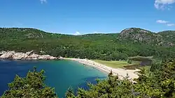 The 27-mile (43 km) Park Loop Road leads to many scenic viewpoints along the coast, through forests and to the top of Cadillac Mountain.[14] The road traverses the eastern side of Mount Desert Island in a one-way, clockwise direction from Bar Harbor to Seal Harbor, passing features such as the Tarn (a pond), Champlain Mountain (location of a popular, exposed cliffside trail named Precipice),[16][17][18] the Beehive (another, smaller mountain), Sand Beach (a saltwater swimming area), Gorham Mountain, Thunder Hole (a crevasse into which waves crash loudly), Otter Cliff, Otter Cove, Seal Harbor, Jordan Pond, Pemetic Mountain, the Bubbles, Bubble Rock, Bubble Pond, Eagle Lake, and the side road to the summit of Cadillac Mountain. Some of the island's west side features include Echo Lake and beach (a designated freshwater swimming area), Acadia Mountain, Beech Mountain, Long Pond, and Seal Cove Pond. Bass Harbor Head Light is situated atop a cliff on the southernmost tip of the west side of the island.[7] Baker Island Light and Bear Island Light are the other two lighthouses managed by Acadia.[19]