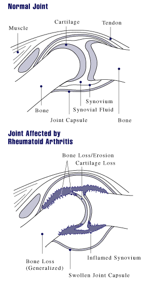 Rheumatoid arthritis is an autoimmune disorder characterised by the immune system's attack on healthy body cells, causing inflammation in multiple areas of the body.[29] In individuals with rheumatoid arthritis, the immune system specifically targets the synovium, a membrane lining the joints in our body.[30] The synovium plays a crucial role in producing a fluid that lubricates the joints, enabling smooth movement.[30] The attack on synovium results in chronic inflammation, causing the thickening and swelling of the synovium, thereby leading to the formation of an abnormal tissue layer known as pannus.[31] Over time, this process contributes to joint pain, cartilage damage, bone erosion, swelling, and stiffness.[32]