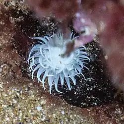 Actinothoe sphyrodeta, the sandalled anemone,[2] is a small sea anemone in the family Sagartiidae. It is native to the northeastern Atlantic Ocean and is common on the north, west and south coasts of Britain. It is usually grey or whitish but may have an orange oral disc. The translucent white tentacles that grow around the edge of the oral disc can number up to 120.