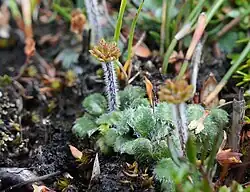 Actinotus bellidioides is a small perennial herb about 3 cm (1.2 in) wide, forming tufts through branching rootstocks.[5] Its thick, dark green leaves grow in a basal rosette, measuring 0.3 to 1.0 cm long and ranging from spoon-shaped to round, often with small, rounded teeth or shallow lobes. The leaves can be softly hairy or nearly smooth on top, with a rounded tip and a short stalk that tapers at the base.[5][6]