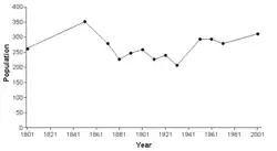 In 2017, there were 143 households in the civil parish.[39] In 2006, the total population of the civil parish was estimated as 340.[30] In the 2001 census, the recorded population was 311.[40] Although this represents an increase of around 20% from 1901, the population remains below the 1851 figure (see graph). In 2001, 53.7% of the population were female and 98.4% of householders were white.[40][41] Residents had an average (median) age of 38.0 years, with 23.2% aged under 16 and 12.2% aged 75 and over.[40] The parish had a total of 124 dwellings, with an average household size of 2.55. 65.3% of dwellings were owner occupied; 21.0% were rented from the council or a housing association and 12.1% from a private landlord.[32] 77.9% of households owned one or more cars.[41] Of those aged 16–74, 45.3% held few or no academic qualifications (less than five GCSE passes or equivalent).[37] According to the census, 1.5% of those aged 16–74 were unemployed and 27.9% were economically inactive.[37]