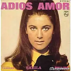 "Adiós Amor" is a 1967 hit French-language song by French singer Sheila.[1] It was one of the series of four hit singles in 1967 which made her best-selling artist of the year.[2] Lyrics were by Jacques Plante, music by Claude Carrère and the recording was produced by American Sam Clayton. The song begins "Je ressens de l'amour pour toi."