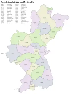 There are 28 postal districts within Aarhus Municipality although some only partially such as 8660 Skanderborg and *8464 Galten which are almost entirely within Skanderborg Municipality.[7] References to postal districts can sometimes be used in commonplace vernacular as analogous to city districts or neighborhoods in Aarhus.[8]