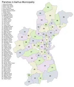 Aarhus Municipality contains 58 parishes split between the 4 deaneries Århus Domprovsti, Århus Nordre Provsti, Århus Søndre Provsti and Arhus Vestre Provsti, all part of the Diocese of Aarhus. Parishes on the municipal borders tend to roughly follow those borders with only a few exceptions such as Vitved Parish which is a part of both Aarhus and Skanderborg Municipality.[9][8]