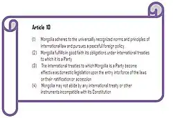 The position of international law as a source of law in Mongolia was elevated following the 1992 Constitution of Mongolia.[6] According to Art 10(3) of the Constitution, international treaties to which Mongolia is a party eventually becomes domestic law, unless they contradict the Constitution itself.[4]