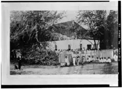 Adobe Schoolhouse (also known as Old Mission School House, Old School House, and Mrs. Bingham's school house; established in 1835) is a one-room school building in Honolulu, Hawaii. Built by the American Board of Commissioners for Foreign Missions (ABCFM), it served for many years as a public school house and as a Sunday school building for Kawaiahaʻo Church, which it predates. Cool, spacious, and generous in the proportions of its length, breadth, lofty ceiling, and deeply recessed windows, the room is representative of early missionary days to the Sandwich Islands.[1] In addition to serving as a school, it was a meeting house, and the home of the Free Kindergarten Association.[2] The Adobe Schoolhouse is a contributing property to the Hawaiian Mission Houses Historic Site and Archives and the Hawaii Capital Historic District.
