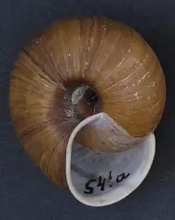 The shell is widely and deeply umbilicated, with a conoid and depressed shape and is dark horn-colored. The shell is finely striated. The spire is conical with a prominent apex and an impressed suture. It has six whorls that increase slowly and are slightly convex. The body whorl is rather flattened above, rounded below, bluntly keeled, and very shortly deflected in front. The aperture is oblique and ovate, with a shining white peristome that is strongly thickened and shortly reflected. The margins approach and are united by a thin callus, with the columellar margin being subvertical. The umbilicus is wide and perspective.[4]