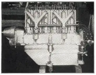 The Aeromarine K-6 is an aircraft engine built by the Aeromarine Plane and Motor Company in 1915. It is an Aeromarine 90hp with a .571 reduction gear. The addition of the reduction gear allowed the engine to produce more power by operating at a higher RPM. This engine made its peak power of 100 hp at 2000 rpm[1][2][3]