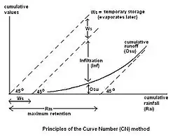 An example is given of surface runoff according to the Curve number method.[3] The applicable equation is: