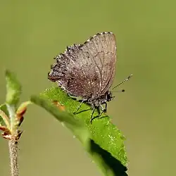 frivaldszkyi Led. (= coerulescens Motsch.) (72 f). Above blackish brown, dusted with bluish grey, particularly at the base, male with a very small yellow scent-patch at the edge of the cell; hindwing with curved median bands which form the border of the darker basal area. Extending from the Altai through Central Asia, Siberia and Mongolia to Amurland. — ferrea Btlr. (= frivaldszkyi Pryer) (72 f) is the eastern form from Corea and Japan; it is larger, the upperside being more evenly dusted with iron-grey to the margin and the orange-yellow scent-patch of the male being much larger. Not rare from March into June; the butterflies belong in Japan to the very first species in the spring.[2]