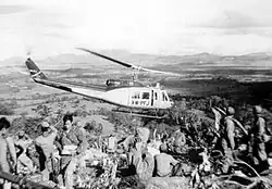 Air America Bell 205 helicopter leaving a Hmong fire support base in the Laotian Plain of Jars, c. 1969
